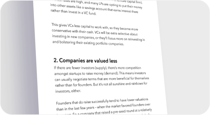 Raise Millions by Hustle Fund VC Page 38 1. VCs are having a harder time raising funds Just like many startups, VCs have to raise money from their LPs (remember, an LP is someone who invests in a venture capital firm). Interest rates are high, and many LPs are opting to put their money into other assets like a savings account that earns interest there rather than invest in a VC fund. This gives VCs less capital to work with, so they become more conservative with their cash. VCs will be extra selective about investing in new companies, or they’ll focus more on reinvesting in and bolstering their existing portfolio companies. 2. Companies are valued less If there are fewer investors (supply), there’s more competition amongst startups to raise money (demand). This means investors can usually negotiate terms that are more beneficial for themselves rather than for founders. But it’s not all sunshine and rainbows for investors, either. Founders that do raise successfully tend to have lower valuations than in the last few years – when the market favored founders over investors. So a company that raised a pre-seed round at a relatively high valuation (say, $8M), is raising their seed-round at a relatively lower valuation (say, $10M). Some companies are having such a hard hustlefund.vc / @hustlefundvc
