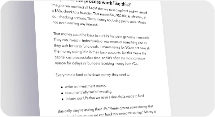 Raise Millions by Hustle Fund VC Page 128 they’ve committed to, the VC may need to make an additional capital call, which can take a few weeks or even months. Why does the process work like this? Imagine we received all $46M that we raised upfront and we issued a $50k check to a founder. That means $45,950,000 is left sitting in our checking account. That’s money not being put to work. Maybe not even earning any interest. That money could be back in our LPs’ hands to generate more cash. They can invest in index funds or real estate or something else as they wait for us to fund deals. It makes sense for VCs to not have all the money sitting idle in their bank accounts. But this means the capital call process takes time, and it’s often the most common reason for delays in founders receiving money from VCs. Every time a fund calls down money, they need to ● write an investment memo ● document why we’re investing ● inform our LPs that we have a deal that’s ready to fund Basically they’re asking their LPs “Please give us some money that we raised from you so we can fund this awesome startup.” Money is normally called down by percentages. So our fund admin (who manages cash flow) may tell our LPs that they want to call down 1% hustlefund.vc / @hustlefundvc