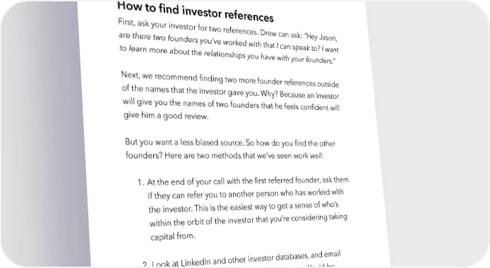 Raise Millions by Hustle Fund VC Page 118 need to know. Trust us, putting in the time to complete this step will help you avoid toxic investors and save you years of pain. How to find investor references First, ask your investor for two references. Drew can ask: “Hey Jason, are there two founders you’ve worked with that I can speak to? I want to learn more about the relationships you have with your founders.” Next, we recommend finding two more founder references outside of the names that the investor gave you. Why? Because an investor will give you the names of two founders that he feels confident will give him a good review. But you want a less biased source. So how do you find the other founders? Here are two methods that we’ve seen work well: 1. At the end of your call with the first referred founder, ask them if they can refer you to another person who has worked with the investor. This is the easiest way to get a sense of who’s within the orbit of the investor that you’re considering taking capital from. 2. Look at LinkedIn and other investor databases, and email founders who have worked with that investor. You’d be surprised at how effective a cold outreach is when you’re doing investor due diligence. Founders are eager to help other founders when they can. hustlefund.vc / @hustlefundvc