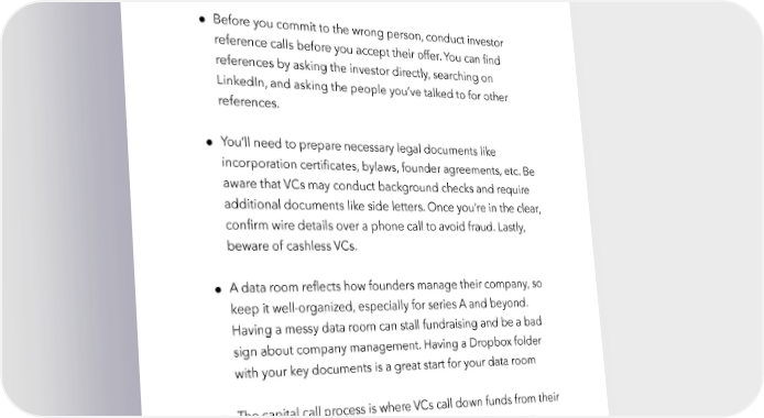 Raise Millions by Hustle Fund VC Page 140 What happens after an investor says “yes” ● Before you commit to the wrong person, conduct investor reference calls before you accept their offer. You can find references by asking the investor directly, searching on LinkedIn, and asking the people you’ve talked to for other references. ● You’ll need to prepare necessary legal documents like incorporation certificates, bylaws, founder agreements, etc. Be aware that VCs may conduct background checks and require additional documents like side letters. Once you’re in the clear, confirm wire details over a phone call to avoid fraud. Lastly, beware of cashless VCs. ● A data room reflects how founders manage their company, so keep it well-organized, especially for series A and beyond. Having a messy data room can stall fundraising and be a bad sign about company management. Having a Dropbox folder with your key documents is a great start for your data room ● The capital call process is where VCs call down funds from their LPs. This might cause delays in founders receiving money, which is why founders should ask insightful questions about the fund's status and available capital. hustlefund.vc / @hustlefundvc