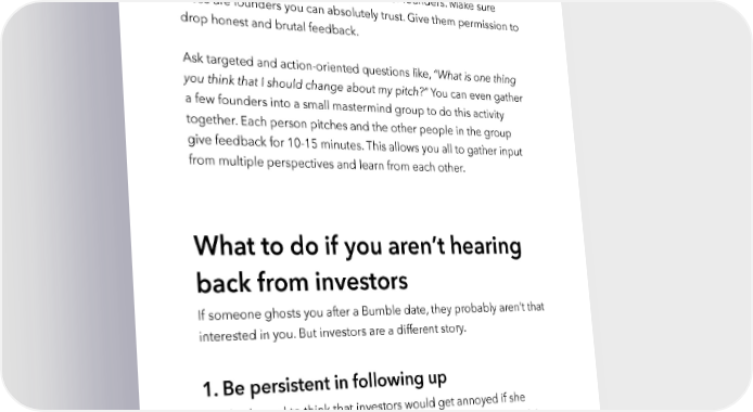 Raise Millions by Hustle Fund VC Page 112 2. – “Pitch” to other founders If you've been talking with investors and the conversations haven’t gone anywhere, pitch your startup to other founders. Make sure these are founders you can absolutely trust. Give them permission to drop honest and brutal feedback. Ask targeted and action-oriented questions like, “What is one thing you think that I should change about my pitch?” You can even gather a few founders into a small mastermind group to do this activity together. Each person pitches and the other people in the group give feedback for 10-15 minutes. This allows you all to gather input from multiple perspectives and learn from each other. What to do if you aren’t hearing back from investors If someone ghosts you after a Bumble date, they probably aren’t that interested in you. But investors are a different story. 1. Be persistent in following up Elizabeth used to think that investors would get annoyed if she bugged them too much. But now that she’s on the other side of the table, she doesn’t even notice if someone has pinged her three times because she’s overwhelmed with emails. hustlefund.vc / @hustlefundvc
