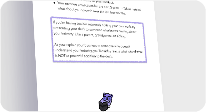 Raise Millions by Hustle Fund VC Page 61 ● Those inspirational quotes by Benjamin Franklin → Cut 'em. You’re innovating. We get it. ● Screenshots of the product → These won’t be nearly as powerful as a live demo of your product. ● Your revenue projections for the next 5 years → Tell us instead what about your growth over the last few months. If you’re having trouble ruthlessly editing your own work, try presenting your deck to someone who knows nothing about your industry. Like a parent, grandparent, or sibling. As you explain your business to someone who doesn’t understand your industry, you’ll quickly realize what is (and what is NOT) a powerful addition to the deck. hustlefund.vc / @hustlefundvc