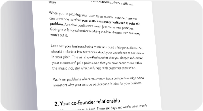Raise Millions by Hustle Fund VC Page 47 So if you want to go into the COVID-eradication business, but your background is in social media marketing... no investor will back you. But if your background is in developing medicine and your co- founder's background is in bio-medical sales... that's a different story. When you're pitching your team to an investor, consider how you can convince her that your team is uniquely positioned to solve this problem. And that confidence won't just come from pedigree. Going to a fancy school or working at a brand-name tech company won't cut it. Let's say your business helps musicians build a bigger audience. You should include a few sentences about your experience as a musician in your pitch. This will show the investor that you deeply understand your customers' pain points. and that you have connections within the music industry, which will help with customer acquisition. Work on problems where your team has a competitive edge. Show investors why your unique background is ideal for your business. 2. Your co-founder relationship Building a company is hard. There are days and weeks when it feels like nothing is going right. There are nights and weekends when you don't see your family because you're grinding so hard. Having a co- founder isn't essential... but it can help. hustlefund.vc / @hustlefundvc