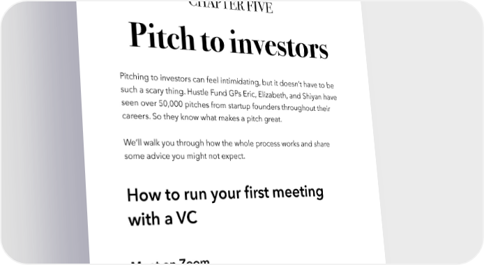 Raise Millions by Hustle Fund VC Page 77 CHAPTER FIVE Pitch to investors Pitching to investors can feel intimidating, but it doesn’t have to be such a scary thing. Hustle Fund GPs Eric, Elizabeth, and Shiyan have seen over 50,000 pitches from startup founders throughout their careers. So they know what makes a pitch great. We’ll walk you through how the whole process works and share some advice you might not expect. How to run your first meeting with a VC Meet on Zoom It might seem weird to pitch over Zoom. But this is how Hustle Fund conducts all our pitch meetings. We love this medium because it allows both parties to see one another in their natural elements. hustlefund.vc / @hustlefundvc