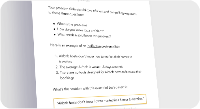 Raise Millions by Hustle Fund VC Page 50 ● This is a huge problem, but people won’t pay for the solution (either because it’s too expensive or too complicated) ● The founder hasn’t done enough customer research to understand the problem Your problem slide should give efficient and compelling responses to these three questions: ● What is the problem? ● How do you know it's a problem? ● Who needs a solution to this problem? Here is an example of an ineffective problem slide: 1. Airbnb hosts don't know how to market their homes to travelers 2. The average Airbnb is vacant 15 days a month 3. There are no tools designed for Airbnb hosts to increase their bookings What's the problem with this example? Let's dissect it: “Airbnb hosts don't know how to market their homes to travelers.” This is a broad, general statement with no data to back it up. hustlefund.vc / @hustlefundvc