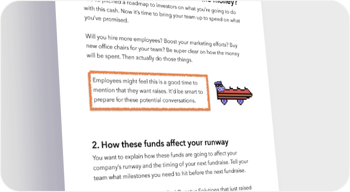 Raise Millions by Hustle Fund VC Page 130 3. How this could be your last fundraise, ever… 1. What are you going to do with the money? You’ve pitched a roadmap to investors on what you’re going to do with this cash. Now it’s time to bring your team up to speed on what you’ve promised. Will you hire more employees? Boost your marketing efforts? Buy new office chairs for your team? Be super clear on how the money will be spent. Then actually do those things. Employees might feel this is a good time to mention that they want raises. It’d be smart to prepare for these potential conversations. 2. How these funds affect your runway You want to explain how these funds are going to affect your company’s runway and the timing of your next fundraise. Tell your team what milestones you need to hit before the next fundraise. Imagine I had a company called Quantus Solutions that just raised $2M. I told investors that I’d generate $10M in revenue with 20 enterprise clients within 12 months. My plan is to raise the next round of funding only when I accomplish this milestone. We hustlefund.vc / @hustlefundvc