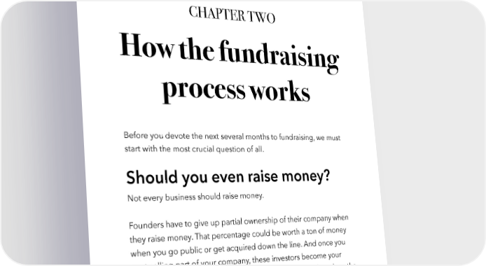 Raise Millions by Hustle Fund VC Page 8 CHAPTER TWO How the fundraising process works Before you devote the next several months to fundraising, we must start with the most crucial question of all. Should you even raise money? Not every business should raise money. Founders have to give up partial ownership of their company when they raise money. That percentage could be worth a ton of money when you go public or get acquired down the line. And once you start selling part of your company, these investors become your business partners. This means they will have opinions about how the business should operate, which may or may not align with your vision. hustlefund.vc / @hustlefundvc