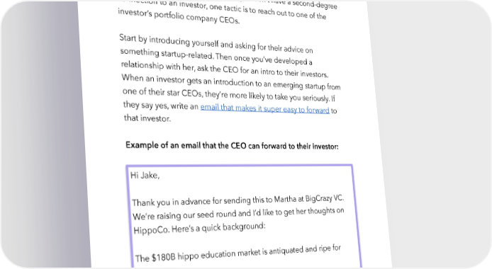 Raise Millions by Hustle Fund VC Page 70 2. Get a warm intro Investors are 93% more likely to take a meeting with someone who has been recommended to them. If you don’t have a second-degree connection to an investor, one tactic is to reach out to one of the investor’s portfolio company CEOs. Start by introducing yourself and asking for their advice on something startup-related. Then once you’ve developed a relationship with her, ask the CEO for an intro to their investors. When an investor gets an introduction to an emerging startup from one of their star CEOs, they’re more likely to take you seriously. If they say yes, write an email that makes it super easy to forward to that investor. Example of an email that the CEO can forward to their investor: Hi Jake, Thank you in advance for sending this to Martha at BigCrazy VC. We’re raising our seed round and I’d like to get her thoughts on HippoCo. Here’s a quick background: The $180B hippo education market is antiquated and ripe for disruption: hustlefund.vc / @hustlefundvc