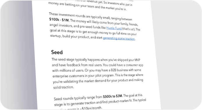 Raise Millions by Hustle Fund VC Page 11 They also want to see data around customer discovery that proves what you’re solving is indeed a big problem and these customers are willing to pay to solve this problem. You probably don’t have many (or any) real users or revenue yet. So investors who put in money are betting on your team and the market you’re in. These investment rounds are typically small, ranging between $100k - $1M. The money will likely come from your family, friends, angel investors, and pre-seed funds like Hustle Fund (that’s us!). The goal at this stage is to get enough money to go full-time on your startup, build your product, and start generating some traction. Seed The seed stage typically happens when you’ve shipped your MVP and have feedback from real users. You could have a consumer app with millions of users. Or you may have a B2B business with some enterprise customers in your pilot program. This is the stage where you're validating the market demand for your product and making solid traction. Seed rounds typically range from $500k to $3M. The goal at this stage is to generate traction and find product-market fit. The typical traction range is ~$10k+/month. hustlefund.vc / @hustlefundvc