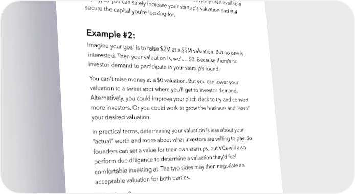 Raise Millions by Hustle Fund VC Page 28 investors are offering a total of $500k… $300k more than you’re aiming to raise. This means you have more demand in your company than available equity, so you can safely increase your startup’s valuation and still secure the capital you’re looking for. Example #2: Imagine your goal is to raise $2M at a $5M valuation. But no one is interested. Then your valuation is, well… $0. Because there’s no investor demand to participate in your startup’s round. You can’t raise money at a $0 valuation. But you can lower your valuation to a sweet spot where you’ll get to investor demand. Alternatively, you could improve your pitch deck to try and convert more investors. Or you could work to grow the business and “earn” your desired valuation. In practical terms, determining your valuation is less about your “actual” worth and more about what investors are willing to pay. So founders can set a value for their own startups, but VCs will also perform due diligence to determine a valuation they’d feel comfortable investing at. The two sides may then negotiate an acceptable valuation for both parties. Still with me? Because there are two different kinds of valuations that you should know: the pre-money valuation and the post-money valuation. hustlefund.vc / @hustlefundvc