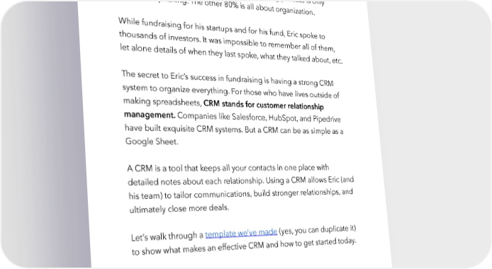 Raise Millions by Hustle Fund VC Page 94 Create your investor CRM Here’s our controversial take: A great fundraising process is only 20% about pitching. The other 80% is all about organization. While fundraising for his startups and for his fund, Eric spoke to thousands of investors. It was impossible to remember all of them, let alone details of when they last spoke, what they talked about, etc. The secret to Eric’s success in fundraising is having a strong CRM system to organize everything. For those who have lives outside of making spreadsheets, CRM stands for customer relationship management. Companies like Salesforce, HubSpot, and Pipedrive have built exquisite CRM systems. But a CRM can be as simple as a Google Sheet. A CRM is a tool that keeps all your contacts in one place with detailed notes about each relationship. Using a CRM allows Eric (and his team) to tailor communications, build stronger relationships, and ultimately close more deals. Let’s walk through a template we’ve made (yes, you can duplicate it) to show what makes an effective CRM and how to get started today. hustlefund.vc / @hustlefundvc