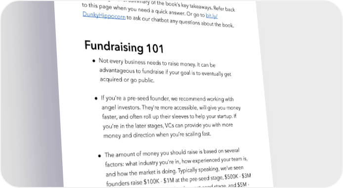 Raise Millions by Hustle Fund VC Page 134 Cheat Sheet This is a high-level summary of the book’s key takeaways. Refer back to this page when you need a quick answer. Or go to bit.ly/ DunkyHippocorn to ask our chatbot any questions about the book. Fundraising 101 ● Not every business needs to raise money. It can be advantageous to fundraise if your goal is to eventually get acquired or go public. ● If you're a pre-seed founder, we recommend working with angel investors. They’re more accessible, will give you money faster, and often roll up their sleeves to help your startup. If you’re in the later stages, VCs can provide you with more money and direction when you’re scaling fast. ● The amount of money you should raise is based on several factors: what industry you’re in, how experienced your team is, and how the market is doing. Typically speaking, we’ve seen founders raise $100K - $1M at the pre-seed stage, $500K - $3M at the seed stage, $1M-$5M at the post-seed stage, and $5M - $10M at the Series A stage. hustlefund.vc / @hustlefundvc