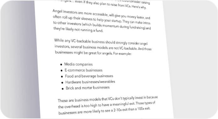 Raise Millions by Hustle Fund VC Page 17 So who should you raise from? Any business that expects to exit and aims to provide its investors with a meaningful return on investment (ROI) should consider raising from angels… even if they also plan to raise from VCs. Here’s why. Angel investors are more accessible, will give you money faster, and often roll up their sleeves to help your startup. They can make intros to other investors (which builds momentum during fundraising) and they’re likely not running a fund. While any VC-backable business should strongly consider angel investors, several business models are not VC-backable. And those businesses might be great for angels. For example: ● Media companies ● E-commerce businesses ● Food and beverage businesses ● Hardware businesses/wearables ● Brick and mortar businesses These are business models that VCs don't typically invest in because the overhead is too high to have a meaningful exit. Those types of businesses are more likely to see a 2-10x exit than a 100x exit. VCs are looking for that one big winner like the next Uber or Instagram. If you’re aiming to be a billion-dollar company one day, hustlefund.vc / @hustlefundvc