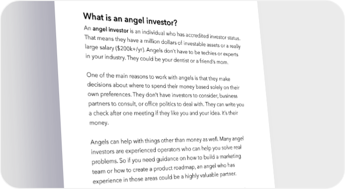Raise Millions by Hustle Fund VC Page 14 Angel investors vs. venture capitalists What is an angel investor? An angel investor is an individual who has accredited investor status. That means they have a million dollars of investable assets or a really large salary ($200k+/yr). Angels don’t have to be techies or experts in your industry. They could be your dentist or a friend’s mom. One of the main reasons to work with angels is that they make decisions about where to spend their money based solely on their own preferences. They don’t have investors to consider, business partners to consult, or office politics to deal with. They can write you a check after one meeting if they like you and your idea. It’s their money. Angels can help with things other than money as well. Many angel investors are experienced operators who can help you solve real problems. So if you need guidance on how to build a marketing team or how to create a product roadmap, an angel who has experience in those areas could be a highly valuable partner. One thing to consider before raising money from angels is that they typically write smaller checks, between $1k to $25k. This means that if you’re raising $1M, you’ll have to close a lot of deals if you only hustlefund.vc / @hustlefundvc