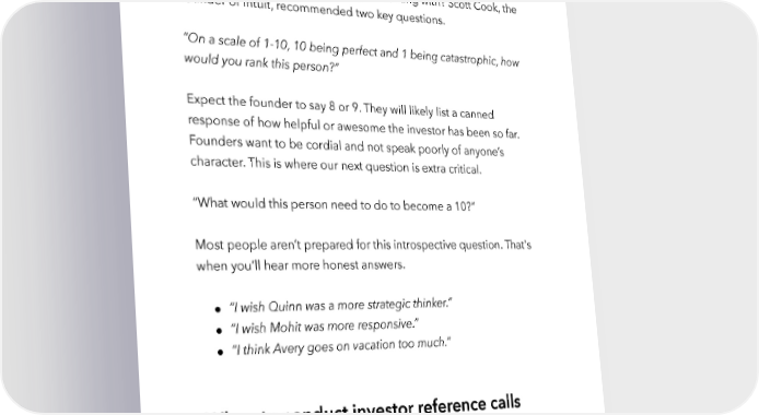 Raise Millions by Hustle Fund VC Page 119 What to ask in your reference calls You’ve now set up several calls. What should you ask these founders about the investors you’re thinking of working with? Scott Cook, the founder of Intuit, recommended two key questions. “On a scale of 1-10, 10 being perfect and 1 being catastrophic, how would you rank this person?” Expect the founder to say 8 or 9. They will likely list a canned response of how helpful or awesome the investor has been so far. Founders want to be cordial and not speak poorly of anyone’s character. This is where our next question is extra critical. “What would this person need to do to become a 10?” Most people aren’t prepared for this introspective question. That's when you’ll hear more honest answers. ● “I wish Quinn was a more strategic thinker.” ● “I wish Mohit was more responsive.” ● “I think Avery goes on vacation too much.” When to conduct investor reference calls Do your investor reference calls AFTER the investor commits and BEFORE you accept. Don’t waste your time doing investor reference calls before they’ve even committed because it might be a wasted hustlefund.vc / @hustlefundvc