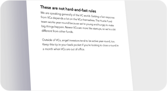 Raise Millions by Hustle Fund VC Page 44 VCs may take a few meetings here and there. But they’re not doing that much. And VCs are off again for Christmas break until early January. Where the cycle starts all over again. These are not hard-and-fast rules We are speaking generally of the VC world. Getting a fast response from VCs depends a lot on the VCs themselves. The Hustle Fund team works year-round because we’re young and hungry to make big things happen. Newer VCs are more like startups, so we’re a bit different from other funds. Outside of VCs, angel investors tend to be active year-round, too. Keep this tip in your back pocket if you’re looking to close a round in a month when VCs are out of office. hustlefund.vc / @hustlefundvc