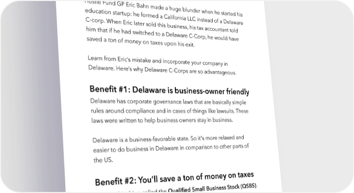Raise Millions by Hustle Fund VC Page 19 Incorporate your company in Delaware Hustle Fund GP Eric Bahn made a huge blunder when he started his education startup: he formed a California LLC instead of a Delaware C-corp. When Eric later sold this business, his tax accountant told him that if he had switched to a Delaware C-Corp, he would have saved a ton of money on taxes upon his exit. Learn from Eric’s mistake and incorporate your company in Delaware. Here’s why Delaware C-Corps are so advantageous. Benefit #1: Delaware is business-owner friendly Delaware has corporate governance laws that are basically simple rules around compliance and in cases of things like lawsuits. These laws were written to help business owners stay in business. Delaware is a business-favorable state. So it's more relaxed and easier to do business in Delaware in comparison to other parts of the US. Benefit #2: You’ll save a ton of money on taxes There’s this thing called the Qualified Small Business Stock (QSBS). If your business is a Delaware C-Corp and has been around for more than five years before getting acquired, you could potentially be hustlefund.vc / @hustlefundvc