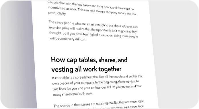 Raise Millions by Hustle Fund VC Page 32 Here’s the problem: joining a team with a high valuation means that the price for the stock options is also high. Employees will realize that they can’t actually afford to buy their options. Couple that with the low salary and long hours, and they won’t be incentivized at work. This can lead to ugly company culture and low productivity. The savvy people who are smart enough to ask about valuation and exercise price will realize that the opportunity isn’t as good as they thought. So if you have too high of a valuation, hiring those people will become very difficult. How cap tables, shares, and vesting all work together A cap table is a spreadsheet that lists all the people and entities that own pieces of your company. In the beginning, there may just be two lines for you and your co-founder. It’ll list your names and how many shares you both own. The shares in themselves are meaningless. But they are meaningful when you see how much of the pie they represent as a percentage. Every time you give a slice of pizza to an investor or a key employee, they will be granted shares and have some equity in the pie. Their hustlefund.vc / @hustlefundvc