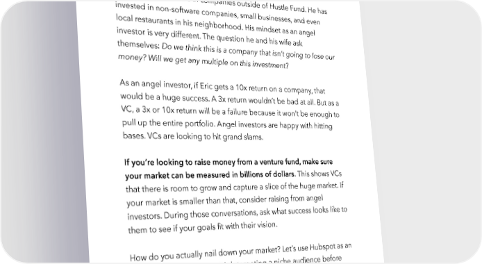 Raise Millions by Hustle Fund VC Page 56 decision-making: Do we believe that you are a founder with the right team and market to support a 100x outcome? Eric also angel invests in companies outside of Hustle Fund. He has invested in non-software companies, small businesses, and even local restaurants in his neighborhood. His mindset as an angel investor is very different. The question he and his wife ask themselves: Do we think this is a company that isn’t going to lose our money? Will we get any multiple on this investment? As an angel investor, if Eric gets a 10x return on a company, that would be a huge success. A 3x return wouldn’t be bad at all. But as a VC, a 3x or 10x return will be a failure because it won’t be enough to pull up the entire portfolio. Angel investors are happy with hitting bases. VCs are looking to hit grand slams. If you’re looking to raise money from a venture fund, make sure your market can be measured in billions of dollars. This shows VCs that there is room to grow and capture a slice of the huge market. If your market is smaller than that, consider raising from angel investors. During those conversations, ask what success looks like to them to see if your goals fit with their vision. How do you actually nail down your market? Let’s use Hubspot as an example. They did a great job targeting a niche audience before later scaling to other areas. They started out targeting small business owners specifically around things like SEO. But fast forward to today, their products are largely targeted at enterprises. They do email hustlefund.vc / @hustlefundvc