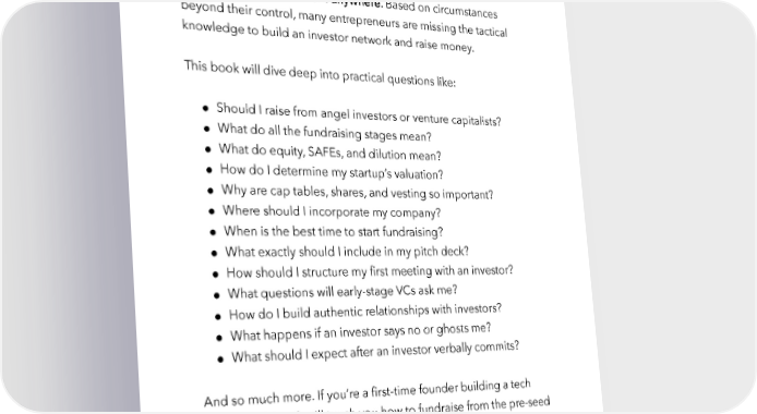 Raise Millions by Hustle Fund VC Page 7 This book is educational and actionable The number one thing we believe is that great founders can look like anyone and come from anywhere. Based on circumstances beyond their control, many entrepreneurs are missing the tactical knowledge to build an investor network and raise money. This book will dive deep into practical questions like: ● Should I raise from angel investors or venture capitalists? ● What do all the fundraising stages mean? ● What do equity, SAFEs, and dilution mean? ● How do I determine my startup’s valuation? ● Why are cap tables, shares, and vesting so important? ● Where should I incorporate my company? ● When is the best time to start fundraising? ● What exactly should I include in my pitch deck? ● How should I structure my first meeting with an investor? ● What questions will early-stage VCs ask me? ● How do I build authentic relationships with investors? ● What happens if an investor says no or ghosts me? ● What should I expect after an investor verbally commits? And so much more. If you’re a first-time founder building a tech startup, this book will teach you how to fundraise from the pre-seed stage all the way to your Series A. Ready? Let’s dive in. hustlefund.vc / @hustlefundvc