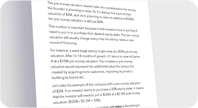Raise Millions by Hustle Fund VC Page 29 Pre-money and post-money valuation The pre-money valuation is the valuation of the business before it receives any outside investment. The pre-money valuation doesn’t take into consideration the money the founder is planning to raise. So if a startup has a pre-money valuation of $2M, and she’s planning to raise an additional $500K, her pre-money valuation is still just $2M. This number is important because it tells investors how much they’ll need to put in to purchase their desired equity stake. The pre-money valuation will usually change every time the startup raises a new round of financing. For instance, a seed-stage startup might raise at a $5M pre-money valuation. After 12-18 months of growth, it’ll return to raise its Series A at a $10M pre-money valuation. The increase in pre-money valuation would represent the additional value the startup has created by acquiring more customers, improving its product, building its brand, etc. Let’s take the example of the company with a pre-money valuation of $2M. If an investor wants to purchase a 20% equity stake, it means that the investor will need to put in $500k at a $2.5M post-money valuation. ($500k / $2.5M = 20%). As the name suggests, the post-money valuation is the startup’s valuation after receiving outside investment. Unlike the pre-money valuation, the post-money valuation is easy to determine: simply add the investment amount to the pre-money valuation. hustlefund.vc / @hustlefundvc