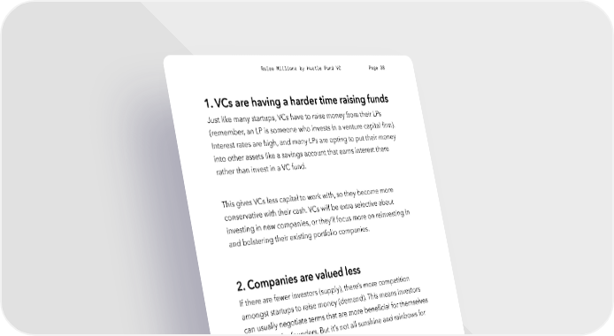 Raise Millions by Hustle Fund VC Page 38 1. VCs are having a harder time raising funds Just like many startups, VCs have to raise money from their LPs (remember, an LP is someone who invests in a venture capital firm). Interest rates are high, and many LPs are opting to put their money into other assets like a savings account that earns interest there rather than invest in a VC fund. This gives VCs less capital to work with, so they become more conservative with their cash. VCs will be extra selective about investing in new companies, or they’ll focus more on reinvesting in and bolstering their existing portfolio companies. 2. Companies are valued less If there are fewer investors (supply), there’s more competition amongst startups to raise money (demand). This means investors can usually negotiate terms that are more beneficial for themselves rather than for founders. But it’s not all sunshine and rainbows for investors, either. Founders that do raise successfully tend to have lower valuations than in the last few years – when the market favored founders over investors. So a company that raised a pre-seed round at a relatively high valuation (say, $8M), is raising their seed-round at a relatively lower valuation (say, $10M). Some companies are having such a hard hustlefund.vc / @hustlefundvc