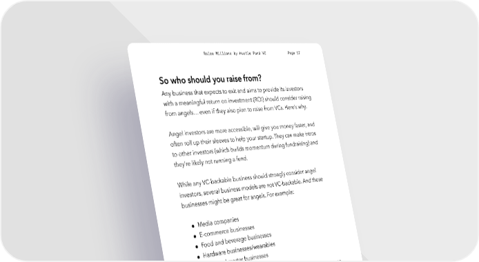 Raise Millions by Hustle Fund VC Page 17 So who should you raise from? Any business that expects to exit and aims to provide its investors with a meaningful return on investment (ROI) should consider raising from angels… even if they also plan to raise from VCs. Here’s why. Angel investors are more accessible, will give you money faster, and often roll up their sleeves to help your startup. They can make intros to other investors (which builds momentum during fundraising) and they’re likely not running a fund. While any VC-backable business should strongly consider angel investors, several business models are not VC-backable. And those businesses might be great for angels. For example: ● Media companies ● E-commerce businesses ● Food and beverage businesses ● Hardware businesses/wearables ● Brick and mortar businesses These are business models that VCs don't typically invest in because the overhead is too high to have a meaningful exit. Those types of businesses are more likely to see a 2-10x exit than a 100x exit. VCs are looking for that one big winner like the next Uber or Instagram. If you’re aiming to be a billion-dollar company one day, hustlefund.vc / @hustlefundvc
