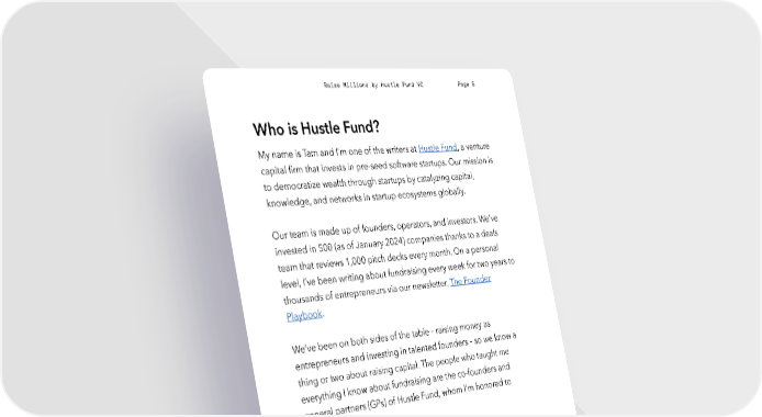 Raise Millions by Hustle Fund VC Page 5 Who is Hustle Fund? My name is Tam and I’m one of the writers at Hustle Fund, a venture capital firm that invests in pre-seed software startups. Our mission is to democratize wealth through startups by catalyzing capital, knowledge, and networks in startup ecosystems globally. Our team is made up of founders, operators, and investors. We’ve invested in 500 (as of January 2024) companies thanks to a deals team that reviews 1,000 pitch decks every month. On a personal level, I’ve been writing about fundraising every week for two years to thousands of entrepreneurs via our newsletter, The Founder Playbook. We’ve been on both sides of the table – raising money as entrepreneurs and investing in talented founders – so we know a thing or two about raising capital. The people who taught me everything I know about fundraising are the co-founders and general partners (GPs) of Hustle Fund, whom I’m honored to introduce below. hustlefund.vc / @hustlefundvc