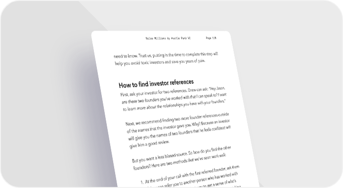 Raise Millions by Hustle Fund VC Page 118 need to know. Trust us, putting in the time to complete this step will help you avoid toxic investors and save you years of pain. How to find investor references First, ask your investor for two references. Drew can ask: “Hey Jason, are there two founders you’ve worked with that I can speak to? I want to learn more about the relationships you have with your founders.” Next, we recommend finding two more founder references outside of the names that the investor gave you. Why? Because an investor will give you the names of two founders that he feels confident will give him a good review. But you want a less biased source. So how do you find the other founders? Here are two methods that we’ve seen work well: 1. At the end of your call with the first referred founder, ask them if they can refer you to another person who has worked with the investor. This is the easiest way to get a sense of who’s within the orbit of the investor that you’re considering taking capital from. 2. Look at LinkedIn and other investor databases, and email founders who have worked with that investor. You’d be surprised at how effective a cold outreach is when you’re doing investor due diligence. Founders are eager to help other founders when they can. hustlefund.vc / @hustlefundvc
