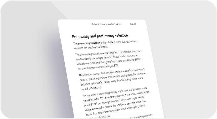 Raise Millions by Hustle Fund VC Page 29 Pre-money and post-money valuation The pre-money valuation is the valuation of the business before it receives any outside investment. The pre-money valuation doesn’t take into consideration the money the founder is planning to raise. So if a startup has a pre-money valuation of $2M, and she’s planning to raise an additional $500K, her pre-money valuation is still just $2M. This number is important because it tells investors how much they’ll need to put in to purchase their desired equity stake. The pre-money valuation will usually change every time the startup raises a new round of financing. For instance, a seed-stage startup might raise at a $5M pre-money valuation. After 12-18 months of growth, it’ll return to raise its Series A at a $10M pre-money valuation. The increase in pre-money valuation would represent the additional value the startup has created by acquiring more customers, improving its product, building its brand, etc. Let’s take the example of the company with a pre-money valuation of $2M. If an investor wants to purchase a 20% equity stake, it means that the investor will need to put in $500k at a $2.5M post-money valuation. ($500k / $2.5M = 20%). As the name suggests, the post-money valuation is the startup’s valuation after receiving outside investment. Unlike the pre-money valuation, the post-money valuation is easy to determine: simply add the investment amount to the pre-money valuation. hustlefund.vc / @hustlefundvc