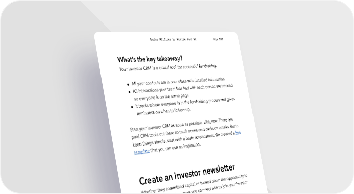Raise Millions by Hustle Fund VC Page 103 What’s the key takeaway? Your investor CRM is a critical tool for successful fundraising. ● All your contacts are in one place with detailed information ● All interactions your team has had with each person are tracked so everyone is on the same page ● It tracks where everyone is in the fundraising process and gives reminders on when to follow up. Start your investor CRM as soon as possible. Like, now. There are paid CRM tools out there to track opens and clicks on emails. But to keep things simple, start with a basic spreadsheet. We created a free template that you can use as inspiration. Create an investor newsletter Whether they committed capital or turned down the opportunity to invest, invite all the investors you connect with to join your investor newsletter. This is a monthly update on what’s happening in your startup. This newsletter has two benefits: 1. It keeps your existing investors engaged – and helps you make important asks when you need support. hustlefund.vc / @hustlefundvc