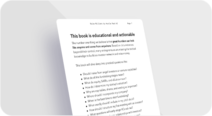 Raise Millions by Hustle Fund VC Page 7 This book is educational and actionable The number one thing we believe is that great founders can look like anyone and come from anywhere. Based on circumstances beyond their control, many entrepreneurs are missing the tactical knowledge to build an investor network and raise money. This book will dive deep into practical questions like: ● Should I raise from angel investors or venture capitalists? ● What do all the fundraising stages mean? ● What do equity, SAFEs, and dilution mean? ● How do I determine my startup’s valuation? ● Why are cap tables, shares, and vesting so important? ● Where should I incorporate my company? ● When is the best time to start fundraising? ● What exactly should I include in my pitch deck? ● How should I structure my first meeting with an investor? ● What questions will early-stage VCs ask me? ● How do I build authentic relationships with investors? ● What happens if an investor says no or ghosts me? ● What should I expect after an investor verbally commits? And so much more. If you’re a first-time founder building a tech startup, this book will teach you how to fundraise from the pre-seed stage all the way to your Series A. Ready? Let’s dive in. hustlefund.vc / @hustlefundvc