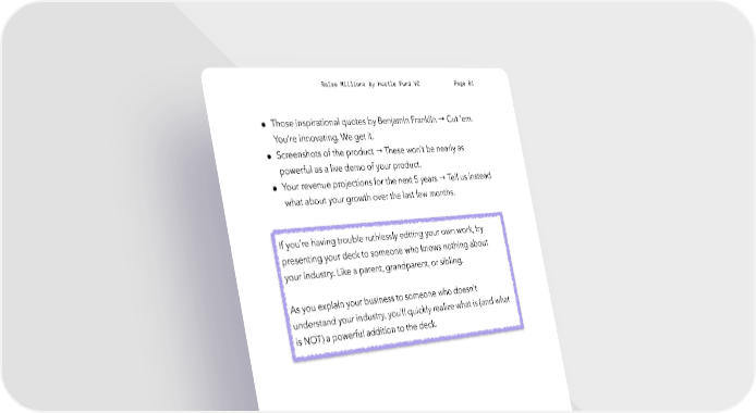 Raise Millions by Hustle Fund VC Page 61 ● Those inspirational quotes by Benjamin Franklin → Cut 'em. You’re innovating. We get it. ● Screenshots of the product → These won’t be nearly as powerful as a live demo of your product. ● Your revenue projections for the next 5 years → Tell us instead what about your growth over the last few months. If you’re having trouble ruthlessly editing your own work, try presenting your deck to someone who knows nothing about your industry. Like a parent, grandparent, or sibling. As you explain your business to someone who doesn’t understand your industry, you’ll quickly realize what is (and what is NOT) a powerful addition to the deck. hustlefund.vc / @hustlefundvc