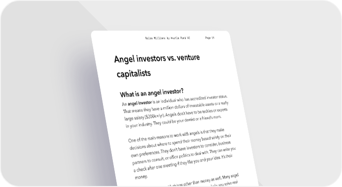 Raise Millions by Hustle Fund VC Page 14 Angel investors vs. venture capitalists What is an angel investor? An angel investor is an individual who has accredited investor status. That means they have a million dollars of investable assets or a really large salary ($200k+/yr). Angels don’t have to be techies or experts in your industry. They could be your dentist or a friend’s mom. One of the main reasons to work with angels is that they make decisions about where to spend their money based solely on their own preferences. They don’t have investors to consider, business partners to consult, or office politics to deal with. They can write you a check after one meeting if they like you and your idea. It’s their money. Angels can help with things other than money as well. Many angel investors are experienced operators who can help you solve real problems. So if you need guidance on how to build a marketing team or how to create a product roadmap, an angel who has experience in those areas could be a highly valuable partner. One thing to consider before raising money from angels is that they typically write smaller checks, between $1k to $25k. This means that if you’re raising $1M, you’ll have to close a lot of deals if you only hustlefund.vc / @hustlefundvc