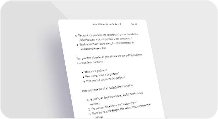 Raise Millions by Hustle Fund VC Page 50 ● This is a huge problem, but people won’t pay for the solution (either because it’s too expensive or too complicated) ● The founder hasn’t done enough customer research to understand the problem Your problem slide should give efficient and compelling responses to these three questions: ● What is the problem? ● How do you know it's a problem? ● Who needs a solution to this problem? Here is an example of an ineffective problem slide: 1. Airbnb hosts don't know how to market their homes to travelers 2. The average Airbnb is vacant 15 days a month 3. There are no tools designed for Airbnb hosts to increase their bookings What's the problem with this example? Let's dissect it: “Airbnb hosts don't know how to market their homes to travelers.” This is a broad, general statement with no data to back it up. hustlefund.vc / @hustlefundvc
