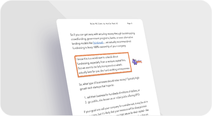 Raise Millions by Hustle Fund VC Page 9 So if you can get away with securing money through bootstrapping, crowdfunding, government programs, banks, or even alternative lending models like Paintbrush… we actually recommend not fundraising to keep 100% ownership of your company. I know this is a weird start to a book about fundraising, especially from a venture capital firm. But we want to be fully transparent on what’s actually best for you, the hard-working entrepreneur. So, what type of businesses should raise money? Typically high- growth tech startups that hope to: 1. sell their business for hundreds of millions of dollars, or 2. go public, also known as an initial public offering (IPO) If your goal is to sell your company for a smaller exit, it may be ok in some cases, but it’s likely that your investors will be disappointed. Because they’re looking for a very high return for their capital – like 100x their investment – so they want to invest in founders that are aiming for a big success. If that’s you, keep reading. You’re in the right place. hustlefund.vc / @hustlefundvc