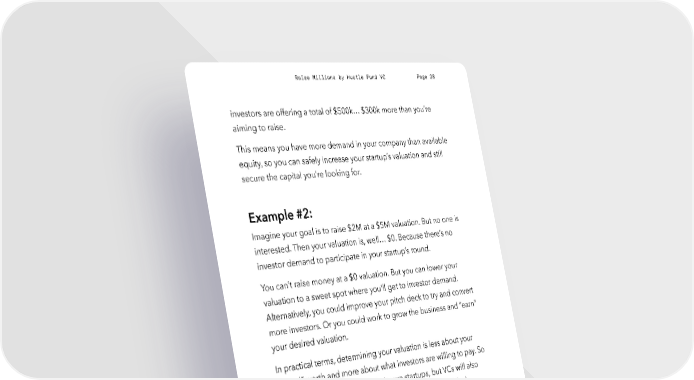 Raise Millions by Hustle Fund VC Page 28 investors are offering a total of $500k… $300k more than you’re aiming to raise. This means you have more demand in your company than available equity, so you can safely increase your startup’s valuation and still secure the capital you’re looking for. Example #2: Imagine your goal is to raise $2M at a $5M valuation. But no one is interested. Then your valuation is, well… $0. Because there’s no investor demand to participate in your startup’s round. You can’t raise money at a $0 valuation. But you can lower your valuation to a sweet spot where you’ll get to investor demand. Alternatively, you could improve your pitch deck to try and convert more investors. Or you could work to grow the business and “earn” your desired valuation. In practical terms, determining your valuation is less about your “actual” worth and more about what investors are willing to pay. So founders can set a value for their own startups, but VCs will also perform due diligence to determine a valuation they’d feel comfortable investing at. The two sides may then negotiate an acceptable valuation for both parties. Still with me? Because there are two different kinds of valuations that you should know: the pre-money valuation and the post-money valuation. hustlefund.vc / @hustlefundvc