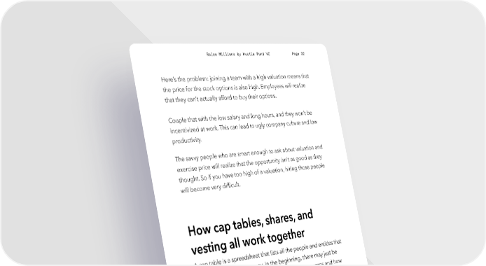 Raise Millions by Hustle Fund VC Page 32 Here’s the problem: joining a team with a high valuation means that the price for the stock options is also high. Employees will realize that they can’t actually afford to buy their options. Couple that with the low salary and long hours, and they won’t be incentivized at work. This can lead to ugly company culture and low productivity. The savvy people who are smart enough to ask about valuation and exercise price will realize that the opportunity isn’t as good as they thought. So if you have too high of a valuation, hiring those people will become very difficult. How cap tables, shares, and vesting all work together A cap table is a spreadsheet that lists all the people and entities that own pieces of your company. In the beginning, there may just be two lines for you and your co-founder. It’ll list your names and how many shares you both own. The shares in themselves are meaningless. But they are meaningful when you see how much of the pie they represent as a percentage. Every time you give a slice of pizza to an investor or a key employee, they will be granted shares and have some equity in the pie. Their hustlefund.vc / @hustlefundvc
