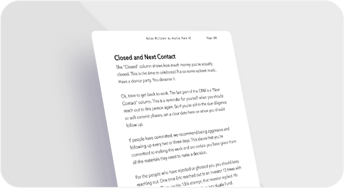 Raise Millions by Hustle Fund VC Page 102 Closed and Next Contact The “Closed” column shows how much money you’ve actually closed. This is the time to celebrate! Put on some upbeat music. Have a dance party. You deserve it. Ok, time to get back to work. The last part of the CRM is a “Next Contact” column. This is a reminder for yourself when you should reach out to this person again. So if you're still in the due diligence or soft commit phases, set a clear date here on when you should follow up. If people have committed, we recommend being aggressive and following up every two or three days. This shows that you’re committed to making this work and are certain you have given them all the materials they need to make a decision. For the people who have rejected or ghosted you, you should keep reaching out. One time Eric reached out to an investor 12 times with no response. Then, on the 13th attempt, that investor replied. He ended up committing half a million dollars into Hustle Fund. So a rejection is never truly a rejection until you get a hard “no.” hustlefund.vc / @hustlefundvc