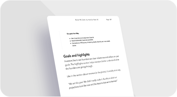 Raise Millions by Hustle Fund VC Page 107 Goals and highlights Investors like to see founders set clear milestones and reflect on past goals. The highlights section helps investors better understand what the founders are going through. Like in the section about revenue (in the photo), it’s totally ok to say, “We set this goal. We didn’t really make it. But this is what our projections look like now and the lessons that we’ve learned.” hustlefund.vc / @hustlefundvc
