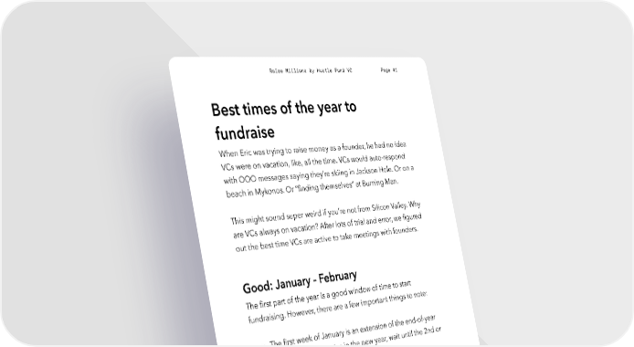 Raise Millions by Hustle Fund VC Page 41 Best times of the year to fundraise When Eric was trying to raise money as a founder, he had no idea VCs were on vacation, like, all the time. VCs would auto-respond with OOO messages saying they’re skiing in Jackson Hole. Or on a beach in Mykonos. Or “finding themselves” at Burning Man. This might sound super weird if you’re not from Silicon Valley. Why are VCs always on vacation? After lots of trial and error, we figured out the best time VCs are active to take meetings with founders. Good: January – February The first part of the year is a good window of time to start fundraising. However, there are a few important things to note: ● The first week of January is an extension of the end-of-year holidays. So if you raise in the new year, wait until the 2nd or 3rd week of January. ● Many VCs have kids in school who have mid-winter breaks in the middle of February. This is the perfect opportunity to take the family to Aspen or Jackson Hole for a mini ski vacation forcing them out of the office. hustlefund.vc / @hustlefundvc