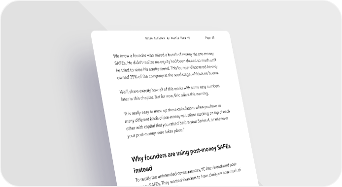 Raise Millions by Hustle Fund VC Page 25 We know a founder who raised a bunch of money via pre-money SAFEs. He didn’t realize his equity had been diluted so much until he tried to raise his equity round. This founder discovered he only owned 35% of the company at the seed stage, which is no bueno. We'll share exactly how all of this works with some easy numbers later in this chapter. But for now, Eric offers this warning, “It is really easy to mess up these calculations when you have so many different kinds of pre-money valuations stacking on top of each other with capital that you raised before your Series A, or whenever your post-money raise takes place.” Why founders are using post-money SAFEs instead To rectify the unintended consequences, YC later introduced post- money SAFEs. They wanted founders to have clarity on how much of the company they’re selling. Here’s the magic equation: (investment) / (post-money valuation) ● Example #1: The founder raises $500k on a $5M post-money valuation. $500k / $5M = 10%. This founder has sold 10% of the company. hustlefund.vc / @hustlefundvc