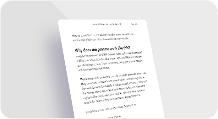 Raise Millions by Hustle Fund VC Page 128 they’ve committed to, the VC may need to make an additional capital call, which can take a few weeks or even months. Why does the process work like this? Imagine we received all $46M that we raised upfront and we issued a $50k check to a founder. That means $45,950,000 is left sitting in our checking account. That’s money not being put to work. Maybe not even earning any interest. That money could be back in our LPs’ hands to generate more cash. They can invest in index funds or real estate or something else as they wait for us to fund deals. It makes sense for VCs to not have all the money sitting idle in their bank accounts. But this means the capital call process takes time, and it’s often the most common reason for delays in founders receiving money from VCs. Every time a fund calls down money, they need to ● write an investment memo ● document why we’re investing ● inform our LPs that we have a deal that’s ready to fund Basically they’re asking their LPs “Please give us some money that we raised from you so we can fund this awesome startup.” Money is normally called down by percentages. So our fund admin (who manages cash flow) may tell our LPs that they want to call down 1% hustlefund.vc / @hustlefundvc