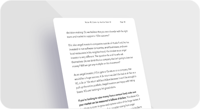 Raise Millions by Hustle Fund VC Page 56 decision-making: Do we believe that you are a founder with the right team and market to support a 100x outcome? Eric also angel invests in companies outside of Hustle Fund. He has invested in non-software companies, small businesses, and even local restaurants in his neighborhood. His mindset as an angel investor is very different. The question he and his wife ask themselves: Do we think this is a company that isn’t going to lose our money? Will we get any multiple on this investment? As an angel investor, if Eric gets a 10x return on a company, that would be a huge success. A 3x return wouldn’t be bad at all. But as a VC, a 3x or 10x return will be a failure because it won’t be enough to pull up the entire portfolio. Angel investors are happy with hitting bases. VCs are looking to hit grand slams. If you’re looking to raise money from a venture fund, make sure your market can be measured in billions of dollars. This shows VCs that there is room to grow and capture a slice of the huge market. If your market is smaller than that, consider raising from angel investors. During those conversations, ask what success looks like to them to see if your goals fit with their vision. How do you actually nail down your market? Let’s use Hubspot as an example. They did a great job targeting a niche audience before later scaling to other areas. They started out targeting small business owners specifically around things like SEO. But fast forward to today, their products are largely targeted at enterprises. They do email hustlefund.vc / @hustlefundvc