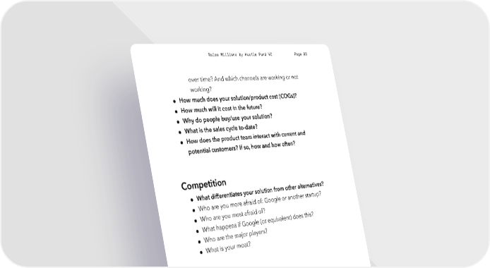 Raise Millions by Hustle Fund VC Page 83 over time? And which channels are working or not working? ● How much does your solution/product cost (COGs)? ● How much will it cost in the future? ● Why do people buy/use your solution? ● What is the sales cycle to-date? ● How does the product team interact with current and potential customers? If so, how and how often? Competition ● What differentiates your solution from other alternatives? ● Who are you more afraid of: Google or another startup? ● Who are you most afraid of? ● What happens if Google (or equivalent) does this? ● Who are the major players? ● What is your moat? Traction ● When did you start the company? ● How many customers do you have to-date? ○ Or how many pilots / contracts are signed? ■ When are the start dates of those pilots / contracts? ■ What are the contingencies? ○ Or how many LOIs signed? What do those look like? ● How much revenue have you generated to date? hustlefund.vc / @hustlefundvc