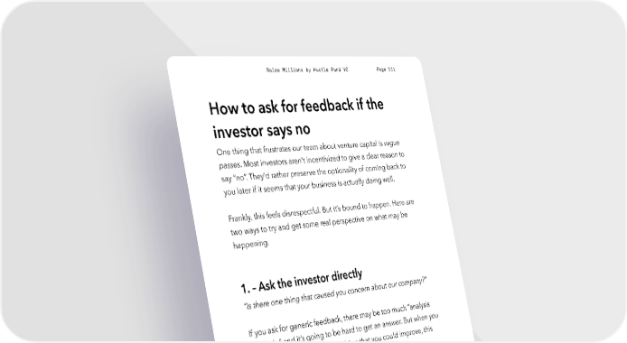 Raise Millions by Hustle Fund VC Page 111 How to ask for feedback if the investor says no One thing that frustrates our team about venture capital is vague passes. Most investors aren’t incentivized to give a clear reason to say “no”. They’d rather preserve the optionality of coming back to you later if it seems that your business is actually doing well. Frankly, this feels disrespectful. But it’s bound to happen. Here are two ways to try and get some real perspective on what may be happening. 1. – Ask the investor directly “Is there one thing that caused you concern about our company?” If you ask for generic feedback, there may be too much “analysis paralysis,” and it’s going to be hard to get an answer. But when you ask for just one reason or one thing that you could improve, this makes it easier for the person to respond. Keep in mind if you use that “one thing” to try and convince them that they were wrong, you’ll likely just jeopardize the relationship. If you do get feedback using this method, we recommend thanking them for their honesty, letting them know you’re addressing that piece, and asking if you can add them to your investor update newsletter. hustlefund.vc / @hustlefundvc
