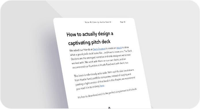 Raise Millions by Hustle Fund VC Page 62 How to actually design a captivating pitch deck We asked our friends at Deck Doctors to create an ebook to show what a good pitch deck looks like... and how to create one. The Deck Doctors are the strongest narrative and slide designers we've ever worked with. We work with them on our own decks, and we recommend our founders at Hustle Fund work with them, too. This book is relentlessly actionable. With real-life slide breakdowns from Hustle Fund portfolio companies. Instead of copying and pasting a light version of that book in this chapter, we recommend you read it in its entirety here. It’s free to download and it’s the perfect complement to this book. “You’re halfway done!” hustlefund.vc / @hustlefundvc