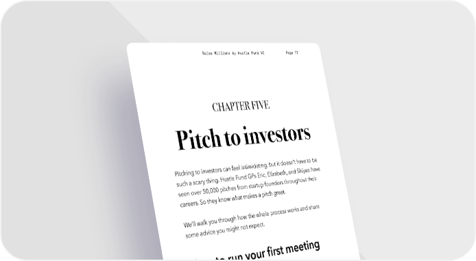 Raise Millions by Hustle Fund VC Page 77 CHAPTER FIVE Pitch to investors Pitching to investors can feel intimidating, but it doesn’t have to be such a scary thing. Hustle Fund GPs Eric, Elizabeth, and Shiyan have seen over 50,000 pitches from startup founders throughout their careers. So they know what makes a pitch great. We’ll walk you through how the whole process works and share some advice you might not expect. How to run your first meeting with a VC Meet on Zoom It might seem weird to pitch over Zoom. But this is how Hustle Fund conducts all our pitch meetings. We love this medium because it allows both parties to see one another in their natural elements. hustlefund.vc / @hustlefundvc