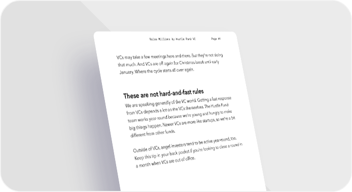 Raise Millions by Hustle Fund VC Page 44 VCs may take a few meetings here and there. But they’re not doing that much. And VCs are off again for Christmas break until early January. Where the cycle starts all over again. These are not hard-and-fast rules We are speaking generally of the VC world. Getting a fast response from VCs depends a lot on the VCs themselves. The Hustle Fund team works year-round because we’re young and hungry to make big things happen. Newer VCs are more like startups, so we’re a bit different from other funds. Outside of VCs, angel investors tend to be active year-round, too. Keep this tip in your back pocket if you’re looking to close a round in a month when VCs are out of office. hustlefund.vc / @hustlefundvc