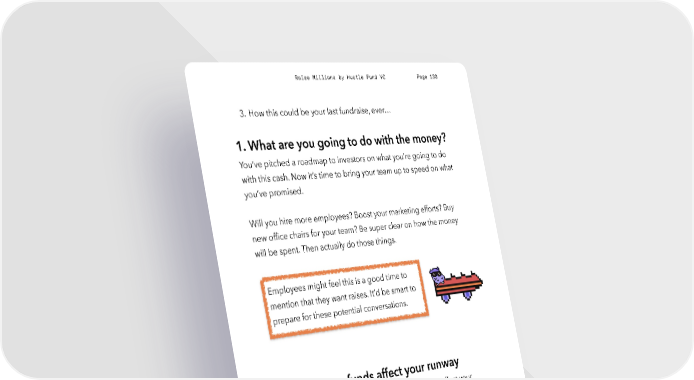 Raise Millions by Hustle Fund VC Page 130 3. How this could be your last fundraise, ever… 1. What are you going to do with the money? You’ve pitched a roadmap to investors on what you’re going to do with this cash. Now it’s time to bring your team up to speed on what you’ve promised. Will you hire more employees? Boost your marketing efforts? Buy new office chairs for your team? Be super clear on how the money will be spent. Then actually do those things. Employees might feel this is a good time to mention that they want raises. It’d be smart to prepare for these potential conversations. 2. How these funds affect your runway You want to explain how these funds are going to affect your company’s runway and the timing of your next fundraise. Tell your team what milestones you need to hit before the next fundraise. Imagine I had a company called Quantus Solutions that just raised $2M. I told investors that I’d generate $10M in revenue with 20 enterprise clients within 12 months. My plan is to raise the next round of funding only when I accomplish this milestone. We hustlefund.vc / @hustlefundvc